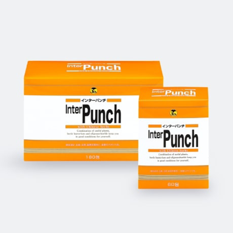 「インターパンチ」は4種(カボチャ種子、オオバコ種子、ベニバナ花、スイカズラ花)の植物とビフィズス菌、ラクチュロースを健康に役立つよう組み合わせた栄養補助食品です。